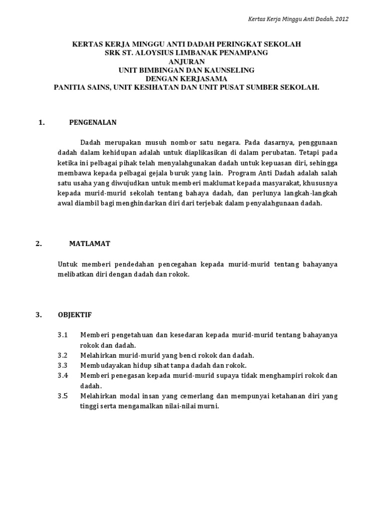 Kertas Kerja Minggu Anti Dadah 2014 2 Doc Pdf Document from reader015.vdokumen.net Sambutan minggu anti dadah diadakan pada setiap tahun di sekolah selaras arahan kementerian pelajaran melalui unit pendidikan pencegahan dadah untuk menyokong sambutan hari anti dadah peringkat kebangsaan. Dadah untuk menyokong sambutan hari anti dadah peringkat kebangsaan. Pelancaran bulan panitia bahasa melayu. (kini tiba giliran calon pembantu anti dadah pula.) Kertas cadangan program minggu anti dadah. Kertas kerja minggu alam sekitar. Kertas kerja proyek perubahan instansional. Diharapkan aktiviti minggu anti dadah ini dapat dilaksanakan dengan jayanya dan dapat mencapai objektif yang diingini.