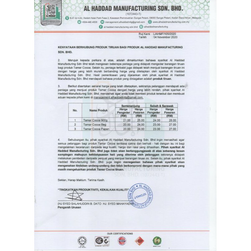 Permohonan agen stok hendaklah melalui kelab zon setiap negeri. Al haddad manufacturing sdn bhd is a manufacturing company which produces premix beverages and has been incorporated in malaysia since 2nd december 2013. Al haddad manufacturing sdn bhd is located at kedah halal park, sungai petani, kedah. The global halal food market is becoming one of the fastest growing market segments. Al haddad manufacturing sdn bhd is feeling excited at kedah halal park, sg.